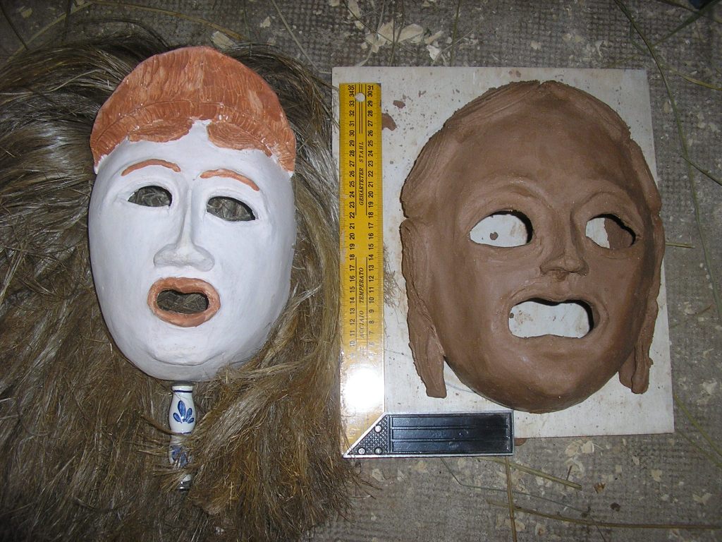 La découverte d’un masque de théâtre en terre blanche au cours de fouilles à Brive a permis de comprendre sans ambiguïté les techniques utilisées pour la réalisation d’un masque. La traduction des chapitres concernés de l’onomasticon de Julius Pollux et les nombreuses représentations de masques conservées dans les musées permettent de réaliser une grande variété de types .