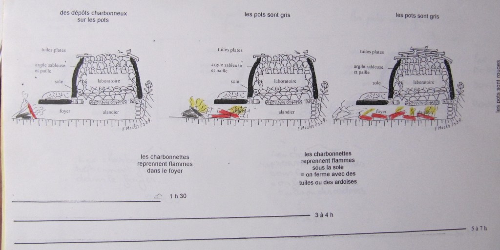 Les vestiges sont ténus néanmoins explicites : Le four a été bâti à même le sol en argile sur clayonnage renforcé de débris de tuiles et de cailloux. En avant de l’ouverture il faut prévoir une bosse de service d’une trentaine de centimètres de profondeur 80 de large et deux mètres de long. La terre récupérées pourra être utilisée pour la construction ou l’isolation thermique