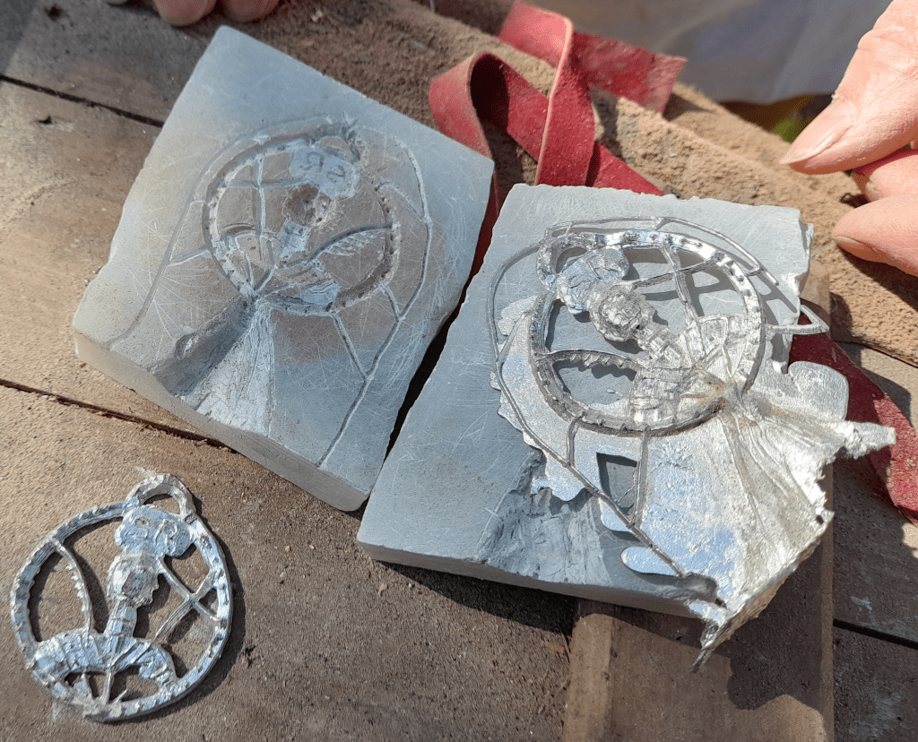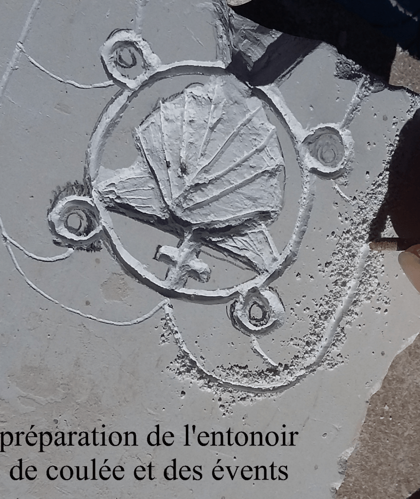 Ces moules seront utilisés ensuite pour y couler de l’étain , moins toxique que le plomb, que nous fondrons nous même grâce la reconstitution d’un four fonctionnant au charbon de bois.
