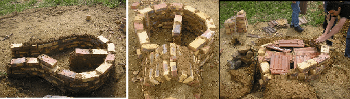 Le four peut être construit dans une fosse à flan de coteau ou bien sur une surface plane et enterré pour l’isoler thermiquement. Il est le plus souvent fait de débris de tuiles ou de briques liés à l’argile sableuse. Pour un four de 80cm de diamètre intérieur il faut compter 4 bonnes brouettes de débris de tuiles plates et d’une vingtaine de tuiles mécaniques de récupération entières et trois bonnes brouettées de terre argileuse. Ces matériaux seront à la charge des organisateurs . Il n’est pas du tout nécessaire d’être un expert pour bâtir ce four sous la direction d’un médiateur. Il faut compter deux jours à trois.
