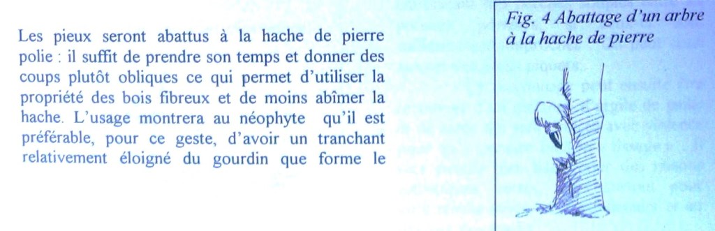 Les pieux seront abattus à la hache de pierre polie : il suffit de prendre son temps et donner des coups plutôt obliques ce qui permet d’utiliser la propriété des bois fibreux et de moins abîmer la hache. L’usage montrera au néophyte qu’il est préférable, pour ce geste, d’avoir un tranchant relativement éloigné du gourdin que forme le manche.