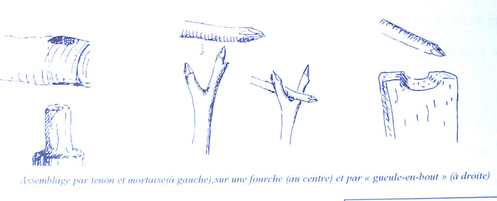 Le néolithique ignorant le fer et la tarière, tous les assemblages tiendront avec des cordes ou des cordelettes le plus souvent en liber de tilleul. Les extrémités des pièces maîtresses ont parfois été aménagées avec un tenon, une mortaise ou une « gueule-en-bout », mais ces aménagements -longs à faire- ne sont pas indispensables puisque la maison que nous avons construite n’en possède aucun, pas même une fourche naturelle et tient uniquement avec des brelages depuis plus de six ans, sans déformation notable.