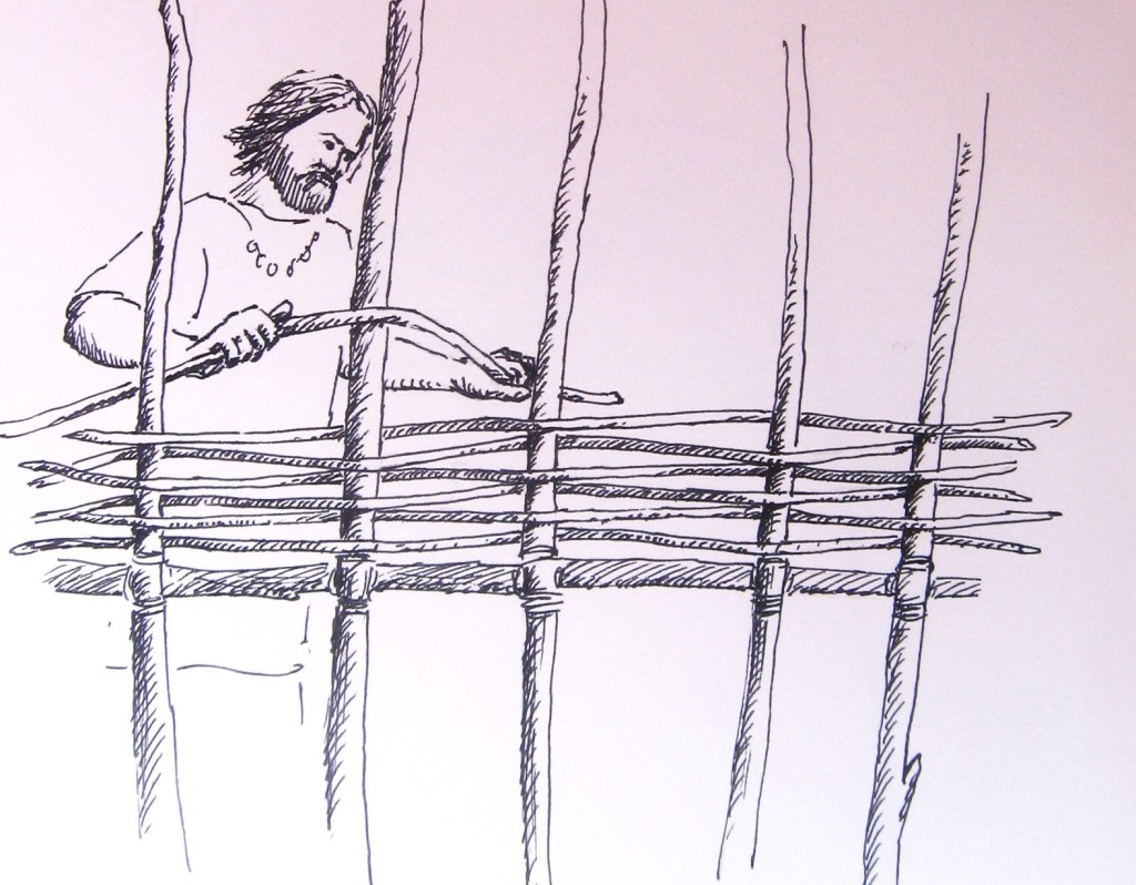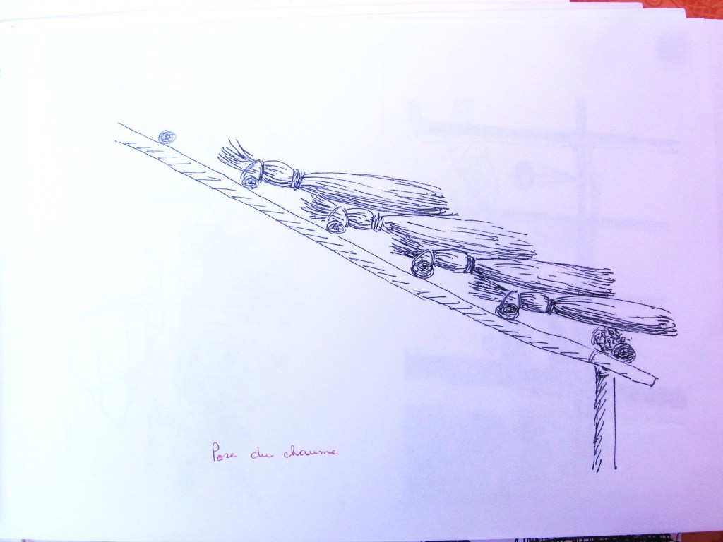 Ce clayonnage peut ensuite être recouvert d’un mélange d’argile de paille et de sable qui sera projeté avec violence pour qu’il pénètre bien le « tissage » . Il sera ensuite bien lissé, pour des raisons esthétiques, certes, mais surtout pour qu’il résiste mieux au ruissellement et au passage des souris.