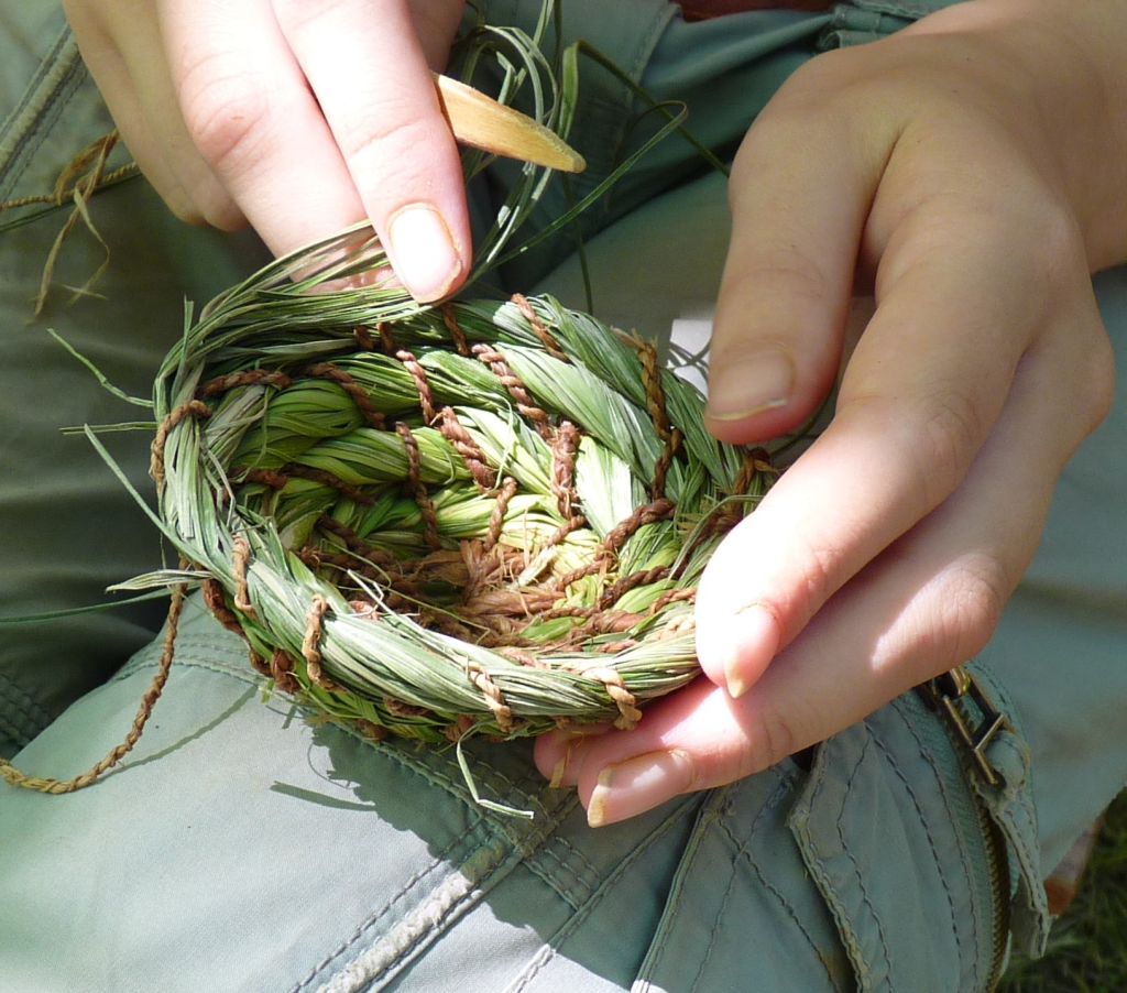 la vannerie spiralée cousue utilise des tiges de graminées (seigle orge blé folle avoine) carex et aussi aiguilles de pin etc ? Ces tiges groupées en un faisceau de diamètre constant sont liées avec des éclisses de noisetier ou bien des écorces de ronce ou encore des cordelettes en liber de tilleul ou de peuplier